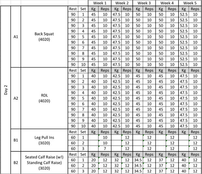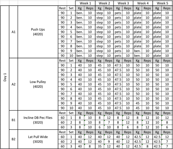 Nachdem ich letzte Woche die Hauptübungen nicht 10×10 mit der vorgegebenen Intensität geschafft hab, war Woche 5 quasi eine Wiederholung. Siehe da, diesmal habe ich sowohl die Push Ups auf den Gewichtscheiben (plate) als auch das Rudern mit 50 kg geschafft. Der Pump war wie letzte Woche nach nur ein paar Sätzen spürbar. Da im Gym viel los war, konnte ich die Nebenübungen nicht im Supersatz machen, was neben der gesteigerten Belastung ausschlaggebend für die niedrige Wiederholungszahl verantwortlich war.