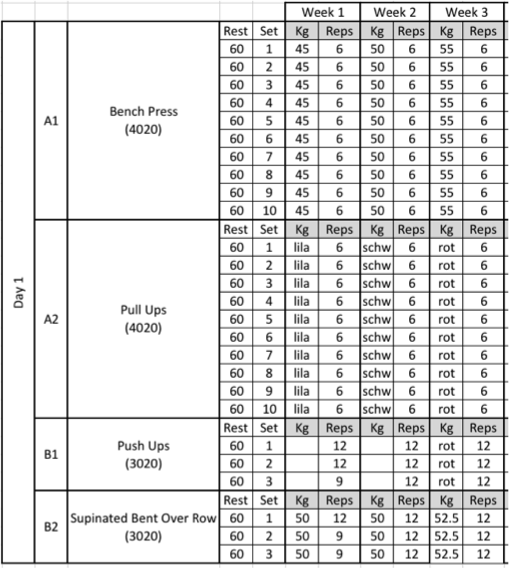 Bei allen Übungen gab es super Fortschritte zu verzeichnen. Beim Bankdrücken waren gleich 5kg mehr drinnen als in der Vorwoche. Besonders freue ich mich darauf nächste Woche die Pull Ups ohne Band zu machen und bin gespannt was meine Schulter dazu sagt. Um die Push Ups zu erschweren habe ich ein Widerstandsband um meinen oberen Rücken gelegt, das ich mit den Händen festgehalten habe. Da ist zwar die Belastung nicht gleichmäßig, aber es ist einfacher als sich selbst eine Hantelscheibe auf den Rücken zu legen 😉