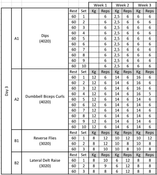 Wie beim Bankdrücken habe ich bei den Dips einen größeren Intensitätssprung gewagt und auch bewältigt. Die Curls habe ich nicht geschafft, was ich schon in Vorwoche vermutet hab.