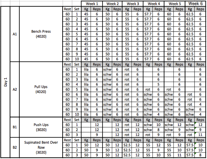 Was die Nebenübungen betrifft bin ich vor allem mit den Push Ups zufrieden. Beim vorgebeugtem Rudern bin ich noch etwas unsicher im unteren Rücken.