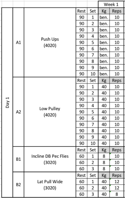 In den ersten 6 Wochen werden pro Trainingstag 2 Hauptübungen in 10 Supersätzen zu je 10 Wiederholungen trainert. Das Tempo pro Wiederholung liegt bei 4020. D.h. 4 Sekunden exzentrisch (nachgebend), 0 Sekunden in Endposition halten, 2 Sekunden konzentrisch (überwindend) und 0 Sekunden in Ausgangsposition halten. Da dadurch jede Wiederholung lange dauert, macht man zwischen den Supersätzen 90 Sekunde Pause (was eigentlich gegen das Supersatzprinzip spricht). Hier ein Beispiel:
