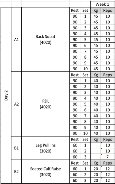 PHCWeek1Day2Am Unterkörpertag mach ich Back Squat (Nackenkniebeuge) und Romanian Deadlift (Rumänisches Kreuzheben) als Hauptübungen. Auf Grund meiner Rückenprobleme habe ich hierfür die Intensität besonders gering angesetzt. Auf Grund des niedrigen Tempos ist der Anspruch an das Herzkreislauf-System gar nicht unerheblich. Zwischendurch habe ich meinen unteren Rücken wieder gespürt, da die Symptome aber nicht stark waren und auch nicht angedauert haben, habe ich die Intensität nicht geändert.