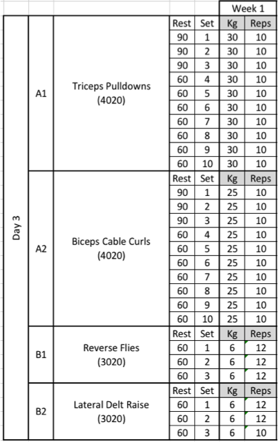 Ähnlich zu Tag 1 ist die Intensität nun hoch genug um schon nach zwei Sätzen einen guten Pump zu spüren, was unheimlich motivierend ist. Gefühlt wurden die Pausen immer kürzer, was mir half konzentriert zu bleiben. Beim Tricepsdrücken musste ich nach 8 Sätzen die Intensität verringern. Das Seitheben habe ich endlich mit 6kg geschafft, das bedeutet, dass nächste Woche 8kg dran sind.